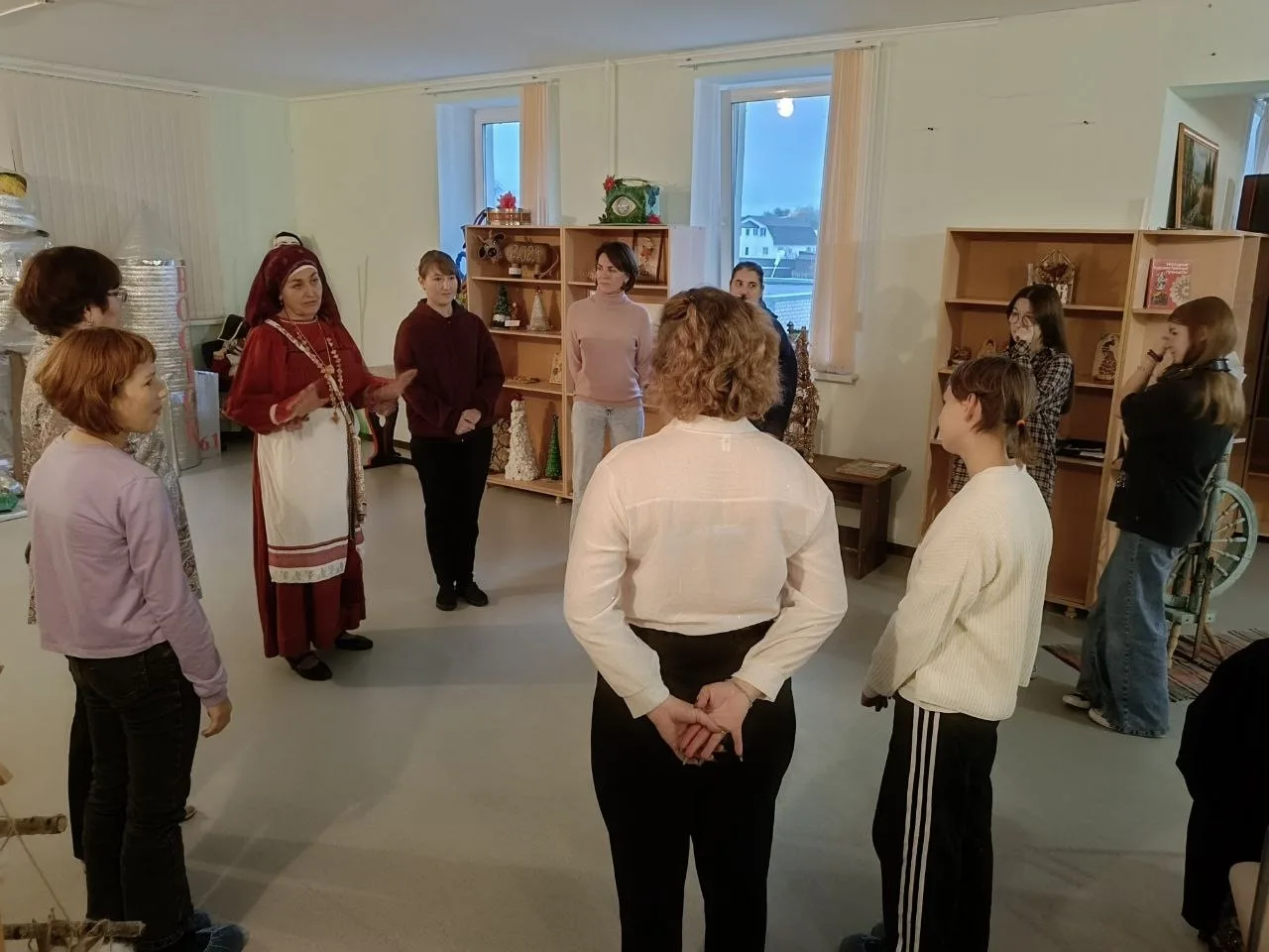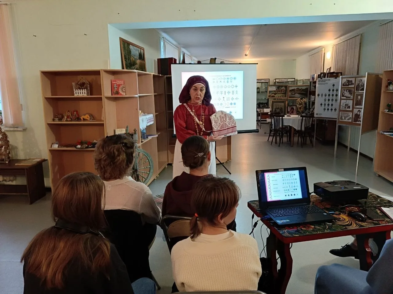 Преподаватель Детской школы искусств Наталья Николаевна Хрусталёва рассказала об устройстве древнерусской избы. Участники узнали о семейных традициях предков, символике обереговых узоров, значении старинных слов.